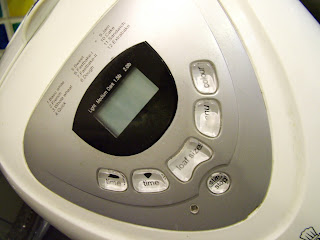 Today I had my first go at using it (despite having some of that lovely fresh loaf from yesterday still to eat!). My first attempt was cut short upon realising that we had no Skimmed Milk Powder, but after a trip to our local shop, that was rectified. We then very nearly went rather wrong when I was measuring out the flour (all quantities given in "cups" and we did not have the original measuring cup that came with it), and put in four (what I thought were) cups (but were actually "half cup" measures). Luckily I was watching through the little window in the top, and puzzling over the unusually 'sloppy' texture when the penny dropped!