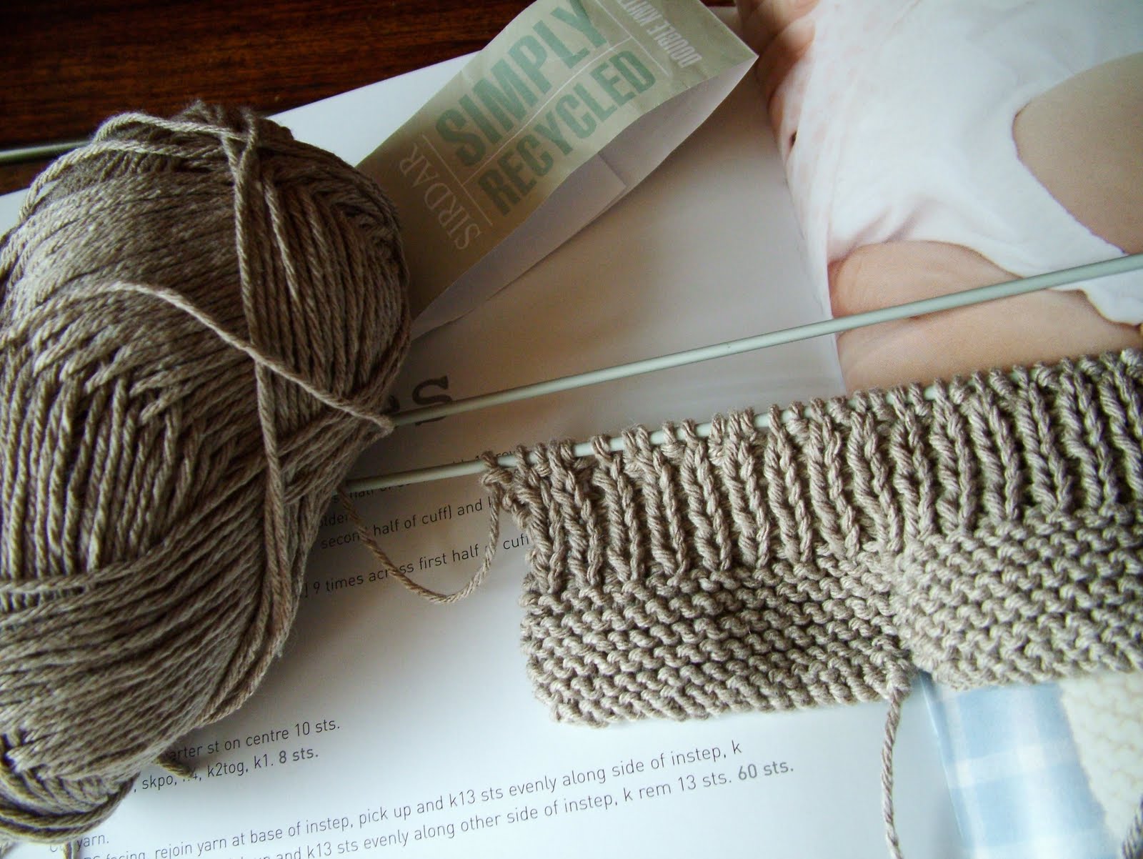 Another small project on the go (from the same lovely book) is a pair of booties for the new baby of another friend. I'm knitting it with some lovely Simply Recycled Sirdar yarn- it's lovely, and makes a change from some of the other yarns I've been knitting with recently.