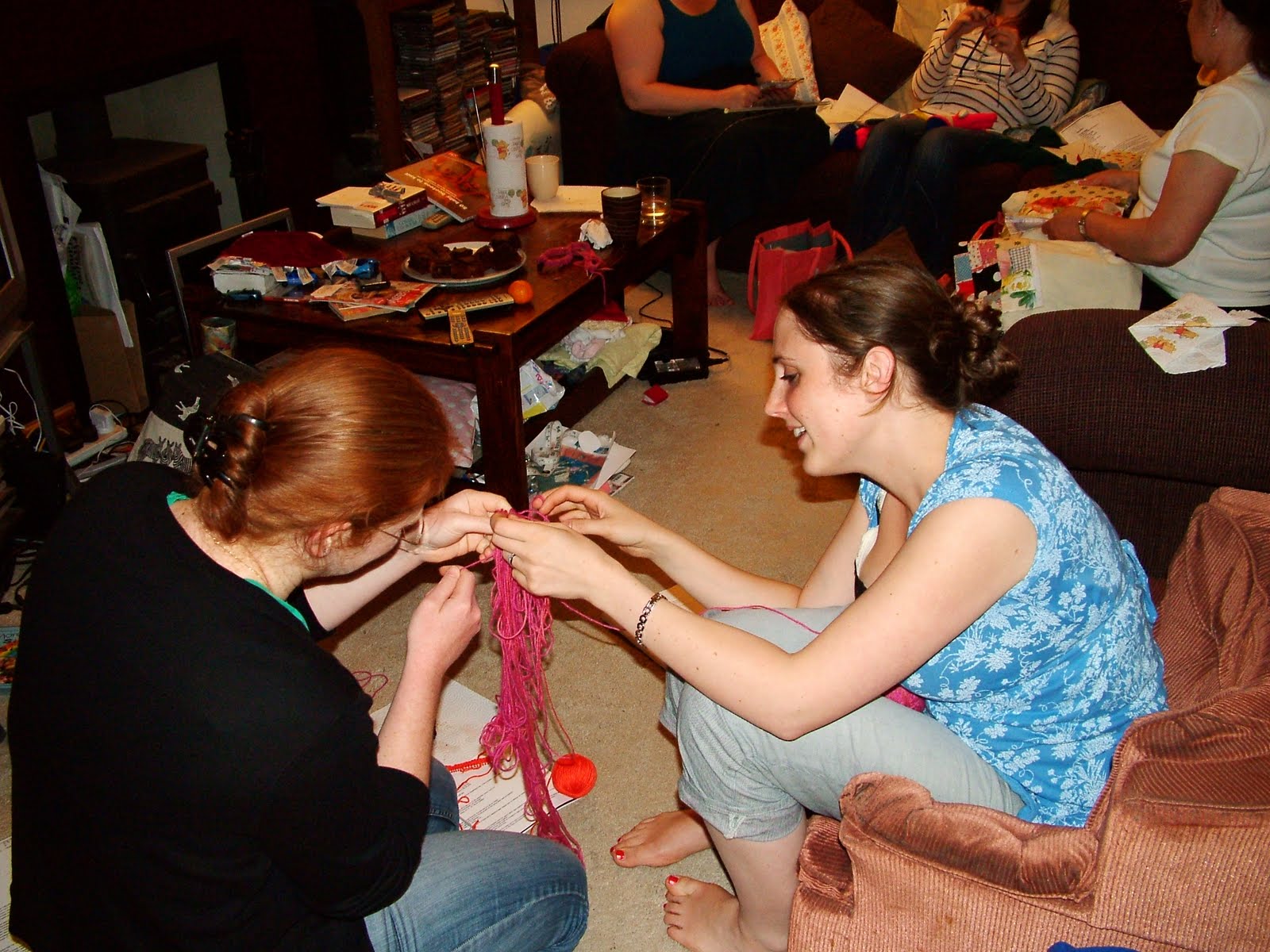 So I decided to follow Meg's advice and ball up my skein of knitpicks wool. It was definitely a good idea, and I figured it'd take about half an hour... Alas no. Given that I'd started knitting with it already, some of the skein wasn't as neatly packaged as when it first arrived and it took nearer 2 hours to ball-up- the entire duration of a Craft evening I had on Tuesday. Still, it made for some fun group activity at times...