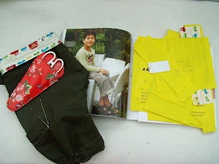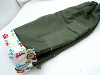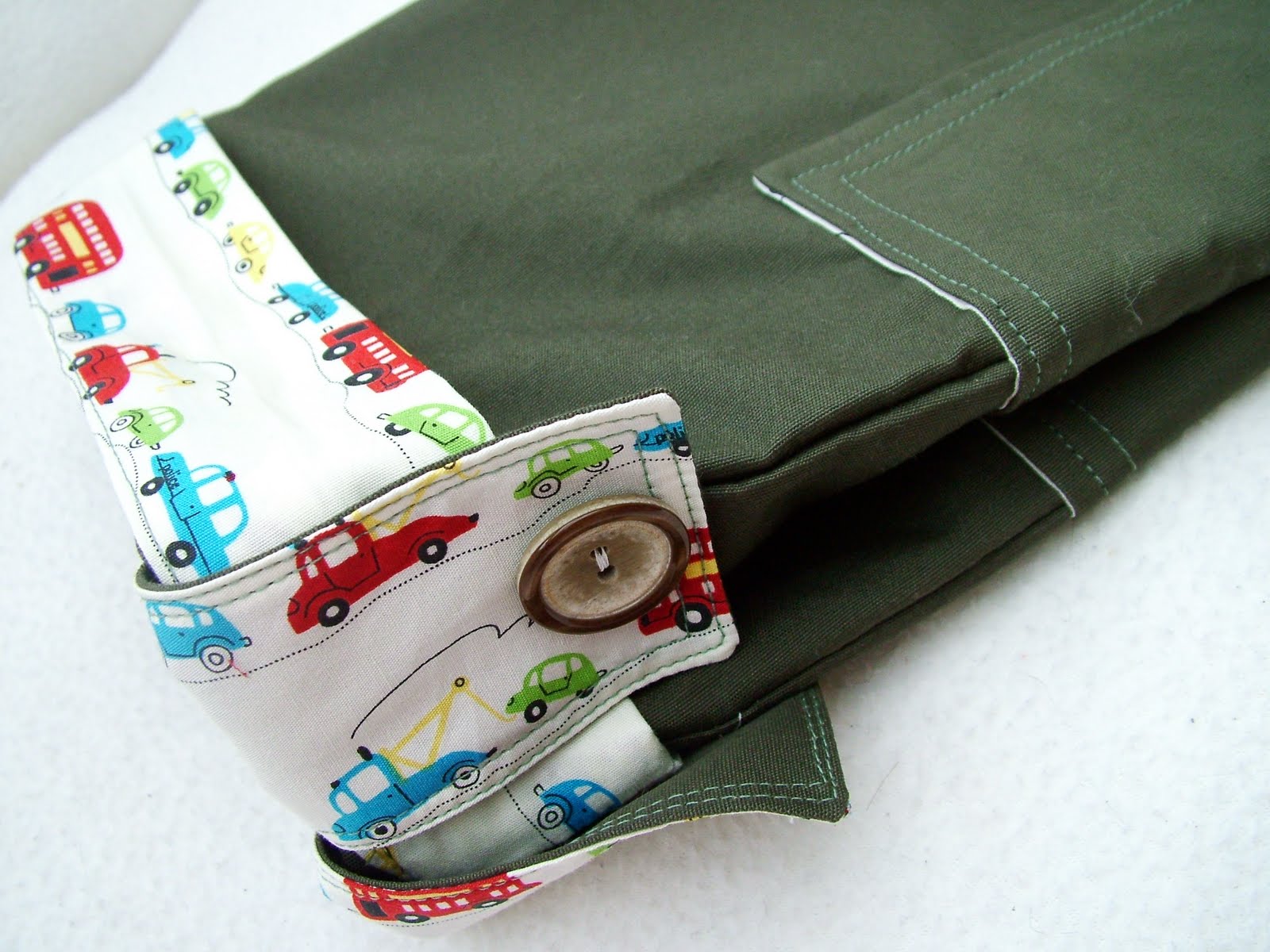 I found some hard-wearing khaki green material, and this fabulous car/digger/bus material for the contrasting turn ups and pockets.
