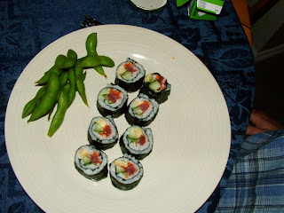 In other news, we went to dinner with some friends last Saturday and rolled sushi for the first time. It was great! Although I was a bit of a coward on the raw fish front, and didn't get any more adventurous than smoked salmon, I loved the ones that I rolled, and had a generally lovely evening!