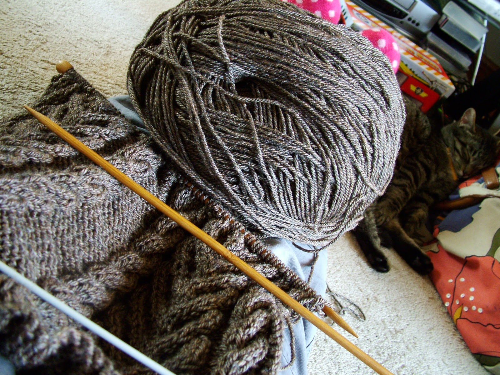 It's a lovely and simple pattern to follow, though when particularly tired in the evenings I have been known to mess up the cabled pattern, then undo and restart whole chunks, as it is more than my brain can fathom to correct cable patterns through dropping down rows!