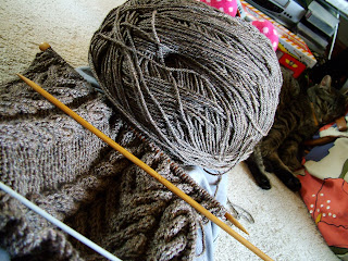 To date, I've completed the back, both fronts, and am about 2/3 the way through the first sleeve (though am once more gathering momentum, although also have a carpet to lay in our almost up-and-running new guest room in the loft, which will undoubtedly be taking some of my time in the next day or two...!).