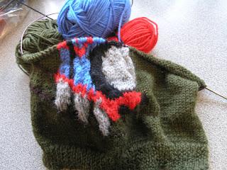 I'm so glad I did (I had been wondering whether just to leave it and carry on anyway, but was sure any time E wore it, I'd be tugging at it to try and get it to 'sit right'). I loved the intricacy of intarsia, and it was so much more satisfying having lots of little bobbins at the back of the work, rather than having lots of balls of wool getting into a tangle.