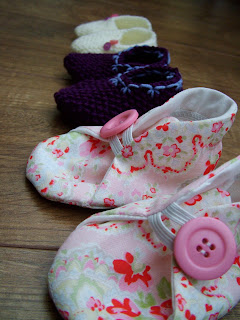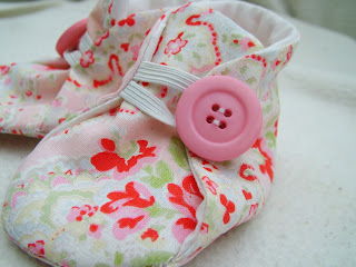 Since getting my new sewing machine, I decided that I needed a little project to get started on it. I chose these lovely baby shoes from "Handmade beginnings" by Anna Maria Horner (who, if you are interested, has a lovely blog). I made them in 0-3 months size, and used a Cath Kidston fabric with a white floral print inside, finished with a lovely big chunky button to adorn them.