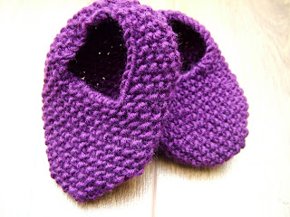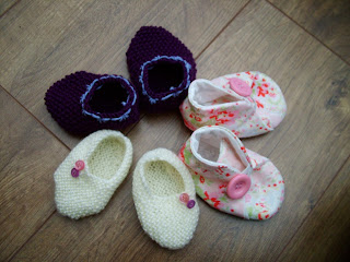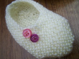 In addition to this, I made a pair of little garter stitch silk slippers from Simple knits for cherished babies, in some 4-ply wool I had left over from a project a while back. I decided to add a couple of odd buttons to give them a little feature.