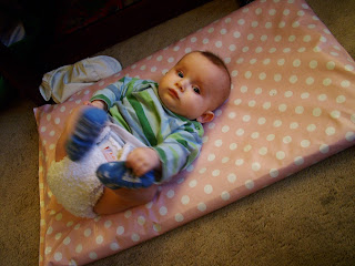 Also, along the lines of being thrifty this new year, one of our Changing mats was starting to break, and rather than throw it away and buy a new one, I bought some oilcloth (at rather a bargain price) and covered it.  The new one is rather more robust now, and a nice pink polka-dot pattern! (As modelled here by William)