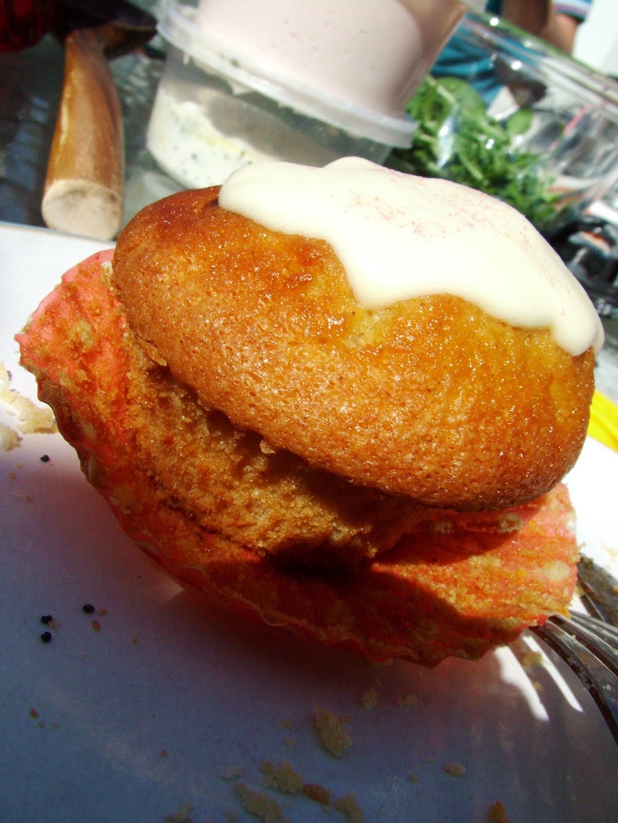 We had a lovely visit from a friend and her boyfriend from London- they bought us a fabulous lunch (including some carrot and cinnamon muffins with a sparkly icing- see below, though the photo doesn't do them justice, and home made quiche!) and we enjoyed several hours sitting in the garden, with silly games being bought out (involving throwing a slightly heavier ball into a paddling pool full of balls...!)