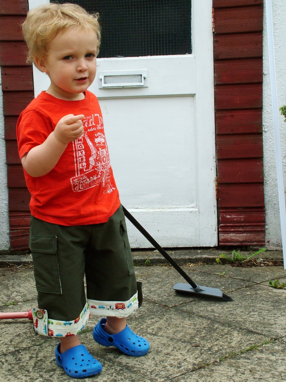 I found some hard-wearing khaki green material, and this fabulous car/digger/bus material for the contrasting turn ups and pockets.